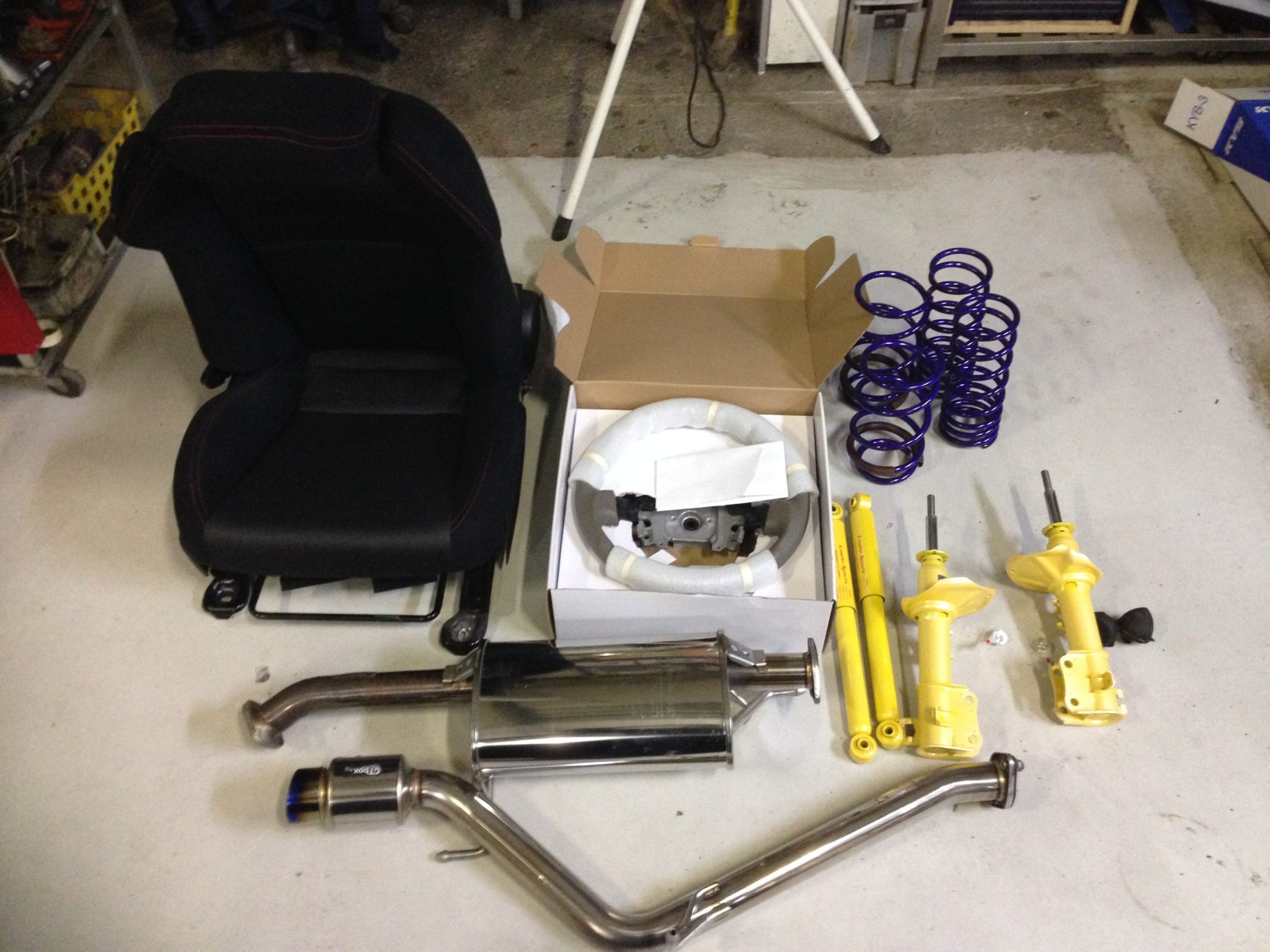 シートにシートレール・ステアリング・マフラー・サスペンションとショックアブソーバー